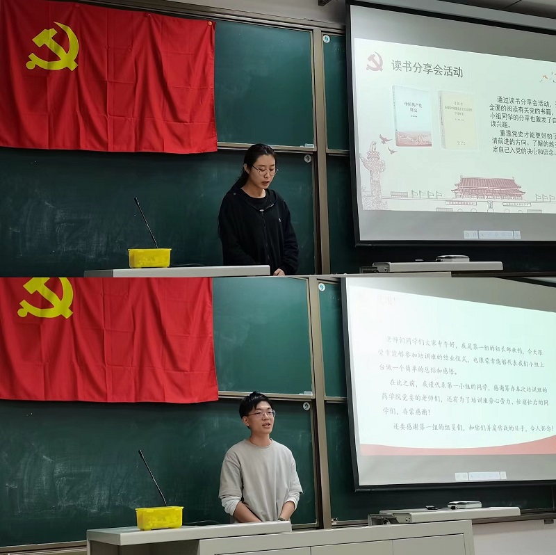 随后,各小组代表依次上台展示了本次培训班期间的所学所思所感。在专题讨论会上,小组成员们与学院党员老师座谈,共同回顾了自己的入党动机和入党初心;在读书分享会活动中,小组成员通过阅读《论中国共产党历史》、《中国共产党简史》等经典书籍,加深了对党史的理解;在线上定向以及文艺汇演活动中,小组成员自编自演《狼牙山五壮士》、《战火中的大学生》等剧目,加深了对党的认识和敬仰之情。经过交流分享,可以感受到同学们在党校培训过程中收获颇丰。