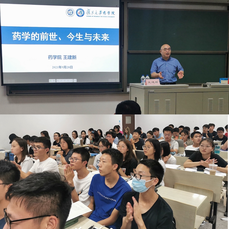 2021年9月28日下午, “青春正当时,启航新征程”h漫 新生第一课在H3101教室开讲。h漫 党委书记、药剂学教授王建新为2021级本科新生开展了题为“药学的前世、今生与未来”的主题报告。