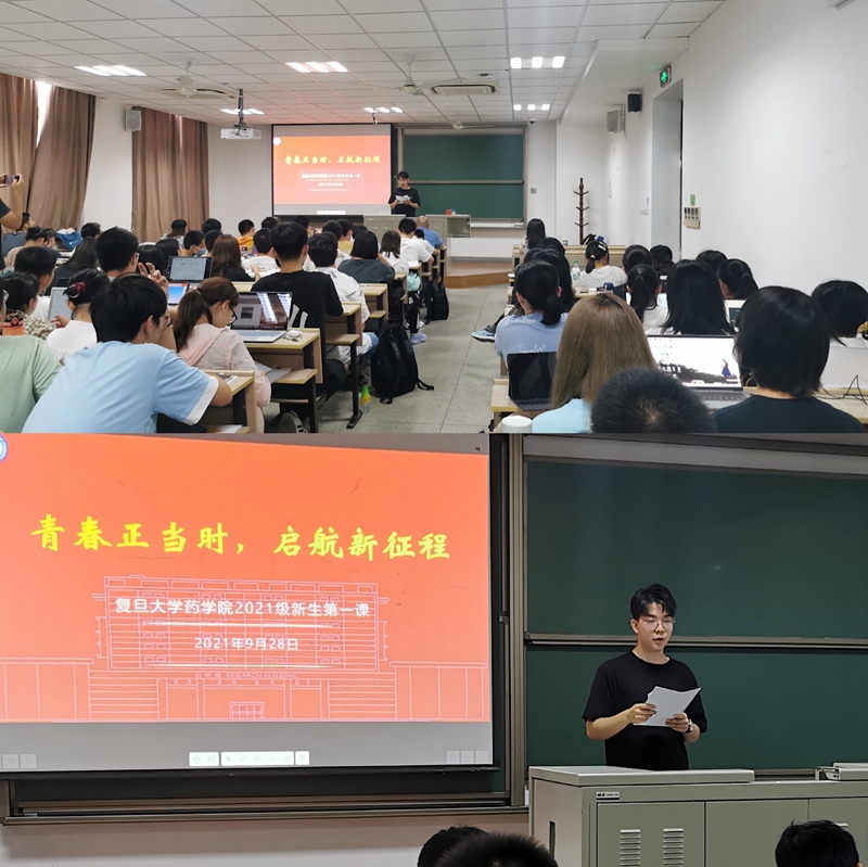 课程伊始,21级新生钱俊成同学分享了他入学以来的所见所闻所感。他提到,h漫 浓厚的学习氛围和自由的人文环境令他在短短几天内,从茫然无措迅速转变为从容不迫。此外,他号召同学们要有“强国不必在我,强国必须有我”的责任与担当,在大学四年里努力学习,成为未来医药行业的中流砥柱。