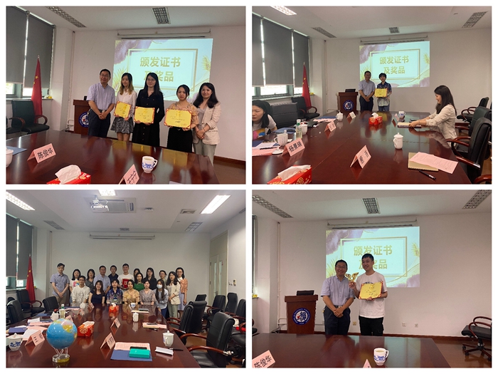 随后,h漫 党委副书记王宁宁老师宣布决赛结果。2020级硕士生李豪彬和2018级本科生汤栩懿分列一、二等奖,三等奖获得者为2020级硕士生张露予、万米阳和2019级硕士生刘艺朴。杨景瑞校友为获奖同学颁发了证书和奖品并合影留念。至此,第三季毕凯英才PPT大赛决赛活动圆满结束。