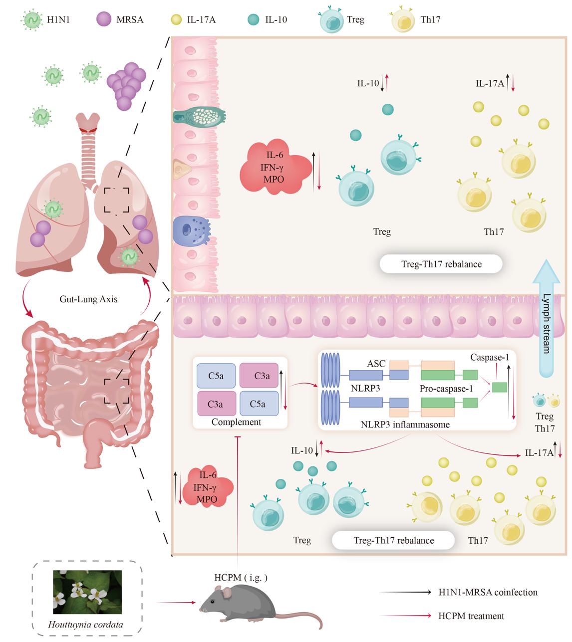 鉴于此,h漫 陈道峰教授、李继扬副教授、力弘副教授研究团队建立了甲型流感病毒(H1N1)与耐甲氧西林金黄色葡萄球菌(MRSA)合并感染的代表性小鼠肺炎模型,并进一步揭示了具有抗补体活性的鱼腥草多糖对H1N1与MRSA合并感染引起的重症肺炎的治疗潜力, 阐明了其通过抑制NLRP3炎症小体并调节肠-肺轴Treg/Th17细胞失衡实现“从肠治肺”的作用途径。相关成果以“An anti-complement homogeneous polysaccharide from Houttuynia cordata ameliorates acute pneumonia with H1N1 and MRSA coinfection through rectifying Treg/Th17 imbalance in the gut–lung axis and NLRP3 inflammasome activation”为题,在线发表于国际知名期刊Acta Pharmaceutica Sinica B。