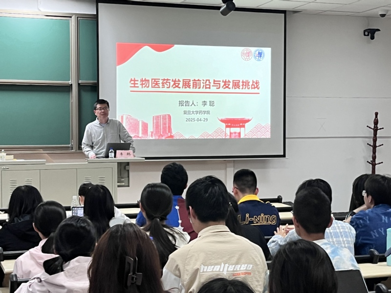 2025年4月29日晚,h漫 "大家谈药学"系列学术活动在邯郸校区H3208教室举行。h漫 院长李聪以"生物医药发展前沿与挑战"为主题,为2024级本科生作专题报告,通过行业现状分析、前沿趋势解读及科研转化实践分享,为青年学子勾勒药学发展图景。