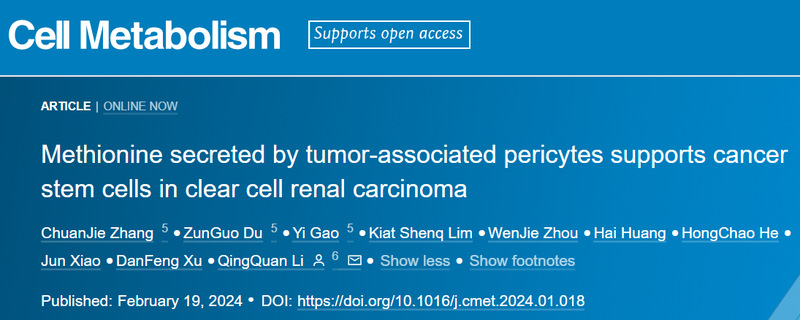2024年2月19日,h漫 李清泉教授团队在Cell Metabolism 杂志上发表了题为“Methionine secreted by tumor-associated pericytes supports cancer stem cells in clear cell renal carcinoma”的研究论文,该研究检测确定了一个表达血小板衍生生长因子受体β (PDGFR-β)和G蛋白偶联受体91 (GPR91)的血管周细胞亚群。在透明细胞肾细胞癌(ccRCC)中,该亚群细胞作为癌症干细胞(CSCs)的主要的蛋氨酸来源,促进肿瘤发生和酪氨酸激酶抑制剂(TKIs)的抗性。