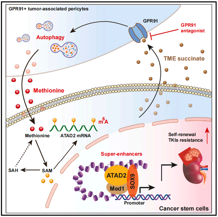 CSCs利用蛋氨酸在ATPase-family-AAA-domain-containing 2 (ATAD2) mRNA中产生稳定的N6 -甲基腺苷,由此产生的ATAD2蛋白复合物与SRY-box转录因子9组装超级增强子,从而指示其靶基因在CSCs中具有显著特征。特异性GRP91拮抗剂靶向PDGFR-β+GPR91+周细胞,降低瘤内蛋氨酸水平,消除CSCs,增强TKIs敏感性。这些结果揭示了PDGFR-β+GPR91+周细胞为CSCs提供支持生态位的机制,并可用于开发治疗ccRCC的靶点。