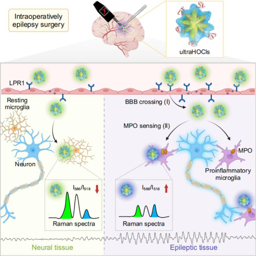 近日,h漫 、h漫 附属华山医院、中科院深圳先进院联合研究团队在Cell Rep Med杂志上发表了题为:“Ultrabright Ratiometric Raman-guided Epilepsy Surgery by Intraoperatively Visualizing Proinflammatory Microglia”(超亮比率型拉曼探针可视化促炎小胶质细胞引导癫痫手术)的研究型论文。基于癫痫患者组织样本,该工作发现了促炎小胶质细胞及其代谢分子髓过氧化物酶在致痫灶大量积累现象。基于计算机辅助拉曼报告分子筛选,构建了一种可以跨血脑屏障的超亮比率型SERS探针,可定量成像促炎小胶质细胞相关高表达的髓过氧化物酶,实现致痫灶的高灵敏、高特异的定位。对癫痫患者切除脑组织的检测特异性高达93.3%,灵敏度高达94.9%。与临床ECoG相比,该策略具有以下优势:(1)不受麻醉干扰;(2)具有长时且稳定的成像时间窗(>1小时);(3)将髓过氧化物酶活性空间分布转化为方便检测的拉曼信号,定位致痫灶更为客观及直接;(4)可以轻松与其他辅助设备(如术中神经监测)联用,在保留功能区域同时最大化致痫灶切除。