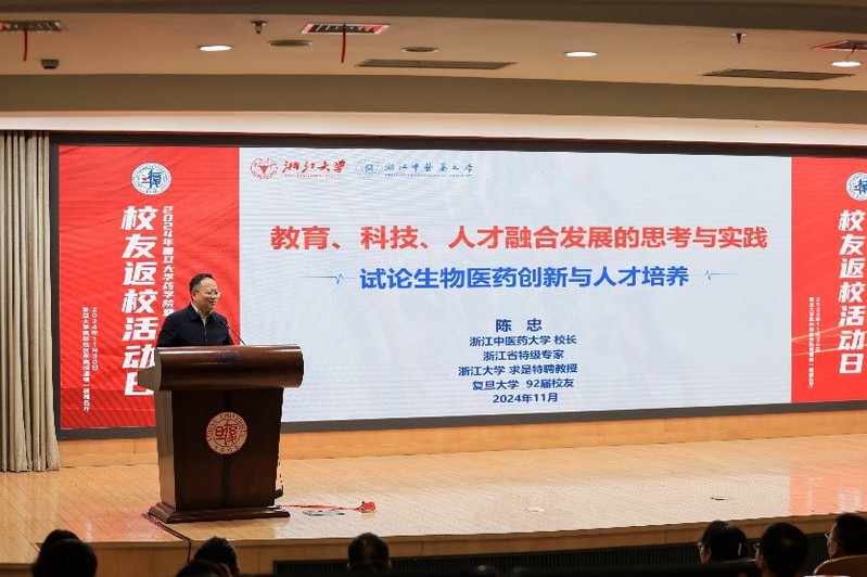 86级药学专业校友、浙江中医药大学校长陈忠应邀作题为“教育、科技、人才融合发展的思考与实践”的主旨报告。陈忠校友从教育、科技、人才融合发展的实践背景和战略意义角度,强调了生物医药领域“育人链”与“科创链”双链融合的必然性与重要性,剖析了目前存在的问题及其原因,并结合生物医药的特点提出了一系列关键对策:例如,打造学科融合、医药联动和校地企合作的三个“圈”;找准驱动力、结合部、培养系与催化剂,推动医药创新领域“育人链”与“创新链”互融互促,以实现学生高质量发展,创新高质量转化。