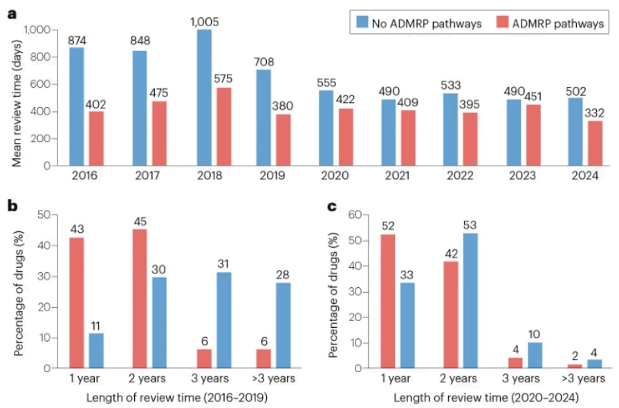 2016-2024年NMPA批准上市新药审评时间:a, 按药物审评审批类型分类;b, 2016-2019年NMPA批准上市新药审评时间分布情况; c, 2020-2024年NMPA批准上市新药审评时间分布情况。