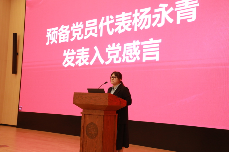 学生预备党员代表杨永青在发言中表示,自己曾有幸采访到云南省劳动模范和先进工作者和文同志。和文同志的事迹如同一盏明灯引领自己深刻领悟到共产党员的责任与担当以及“为人民服务”的使命,也更加坚定了入党初心。她承诺将不断加强党的理论知识学习,严格要求自己,以实际行动服务广大群众,为党和人民的事业贡献自己的力量。