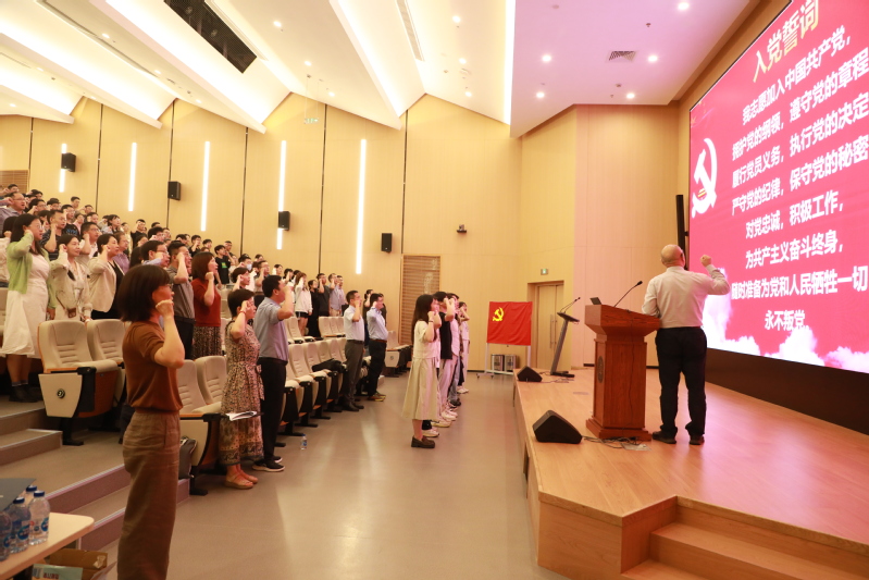 随后,党委书记王建新、副书记王盛、组织委员王洋为师生预备党员代表佩戴党徽。在王建新的领誓下,全体党员面向党旗庄严宣誓,铿锵誓言响彻会场,坚定了每一位党员的初心与信仰。