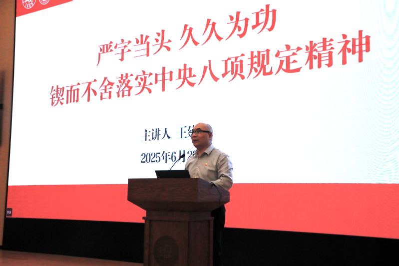 最后,王建新作“严字当头 久久为功 锲而不舍落实中央八项规定精神”专题党课。他深入剖析了学习教育的战略意义、工作背景、系统部署与责任要求,通过鲜活的案例警示,强调作风建设常态化教育的重要性,号召全体党员以作风建设为抓手,推动学院改革与发展迈向新台阶。