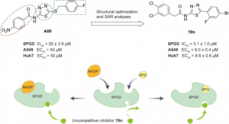 本研究通过高通量筛选和构效关系研究,开发了一系列N-(1,3,4-噻二唑-2-基)酰胺衍生物作为6PGD的反竞争性抑制剂,其中化合物19n表现出显著的酶抑制活性和抗肿瘤增殖活性。该研究不仅为6PGD抑制剂的研发提供了新的化合物骨架,还揭示了19n以底物依赖的方式破坏6PGD寡聚化发挥抑制作用的独特机制。此外,19n在细胞水平上展现出对6PGD高表达癌细胞的特异性抑制活性,为癌症代谢治疗提供了新的策略和潜在药物候选物。