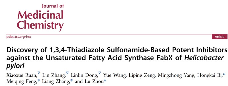 近日,h漫 周璐教授团队联合上海交通大学张良教授团队、h漫 冯美卿教授团队、南京医科大学/海南医科大学毕洪凯教授团队在Journal of Medicinal Chemistry上发表题为“Discovery of 1,3,4-Thiadiazole Sulfonamide-Based Potent Inhibitors against the Unsaturated Fatty Acid Synthase FabX of Helicobacter pylori”的研究性论文,针对特异性抗幽门螺杆菌新靶标脂酰基脱氢酶FabX开发了一系列新型抑制剂。