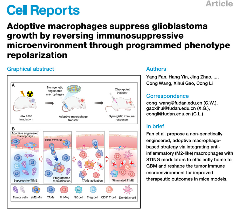 近日,h漫 李聪教授团队在Cell Reports杂志上发表了题为:“Adoptive Macrophages Suppress Glioblastoma Growth by Reversing Immunosuppressive Microenvironment through Programmed Phenotype Repolarization”(表型程序转换巨噬细胞逆转脑胶质瘤免疫抑制微环境)的研究型论文。该工作围绕GBM免疫治疗预后差的临床挑战,提出了程序性调节过继巨噬细胞表型技术,在促进细胞肿瘤入脑归巢情况下逆转胶质瘤免疫抑制微环境。该工作发现巨噬细胞表型与其GBM归巢效率具有相关性,抑炎表型巨噬细胞较促炎表型可更有效地穿越血脑屏障并进入脑肿瘤。据此,课题组构建了活性氧响应性释放干扰素基因刺激物(STING)激动剂的聚合物,其与抑炎表型巨噬细胞共孵育得到工程化M2样巨噬细胞(eM2-Mφs)。静脉注射后,该工程化细胞在初期维持抑炎表型,实现血脑肿瘤屏障高效跨域和肿瘤浸润。随着细胞内STING激动剂逐步释放和积累,工程化巨噬细胞逐渐转变为促炎表型并释放细胞因子逆转肿瘤免疫抑制微环境。实验结果显示单独注射工程化巨噬细胞,或将其与低剂量放疗或免疫检查点抑制剂联合使用,均能够显著抑制GBM模型生长并延长小鼠存活期。该工作充分利用巨噬细胞的高组织迁移性和表型可塑性实现肿瘤免疫抑制微环境活化,为提高脑胶质瘤免疫治疗响应提供了新思路。