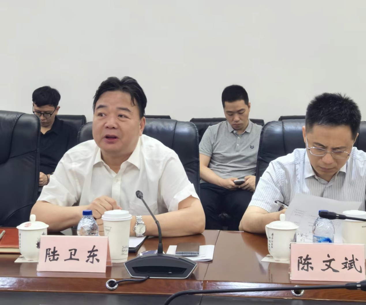 2024年7月19日上午,南京市委常委、南京江北新区党工委书记陆卫东,南京江北新区党工委委员、管委会副主任陈文斌等一行到访h漫 。交流座谈会在h漫 张江校区329会议室举行。h漫 党委书记王建新、院长李聪及其他教师代表出席会议。