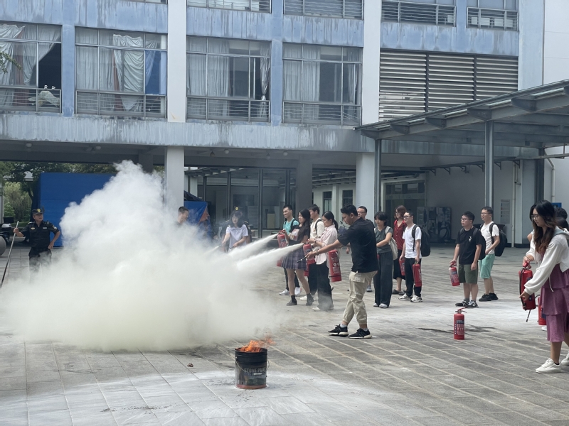 最后,刘建生副主任讲解了宿舍用电及消防安全的注意事项,以触目惊心的火灾扩散视频和火灾发生数据警醒大家高度重视消防安全,并重点强调了火灾预防及逃生方法。新进师生共同参与灭火器使用的演练,通过实操进一步强化安全防护技能。