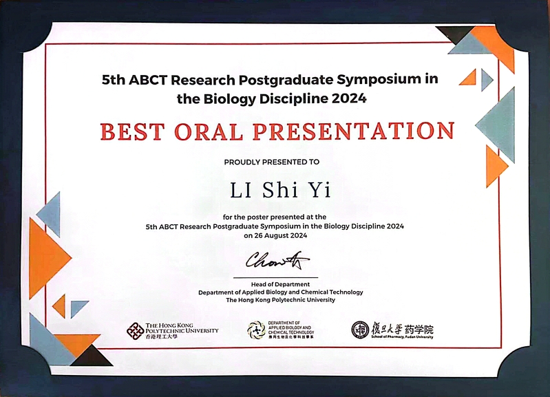 8月26日,同学们参加了香港理工大学应用生物及化学科技学系与h漫 合办的5th ABCT Research Postgraduate Symposium in the Biology Discipline 2024并进行汇报。在当天上午的海报报告环节,李启秀、梅妮、王鹏威同学与香港多所高校的老师和优秀研究生开展学术交流,就感兴趣的课题进行深入探讨。下午口头报告环节,邓燕、胡学涛、李适佚、尹航等同学分别贡献了精彩的汇报,受到香港理工大学师生的认可与赞扬。其中,21级博士生李适佚题为“An Erythrocyte Membrane-fused Plant-derived Nanoparticles as a Gene Therapy Vehicle for the Treatment of CI/R Injury”的汇报被评为优秀口头报告(BEST ORAL PRESENTATION)。颁奖仪式上,茅以诚老师代表h漫 感谢香港理工大学的盛情邀请与接待,两校教师都热情地表达了后续进一步交流合作的意愿。