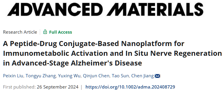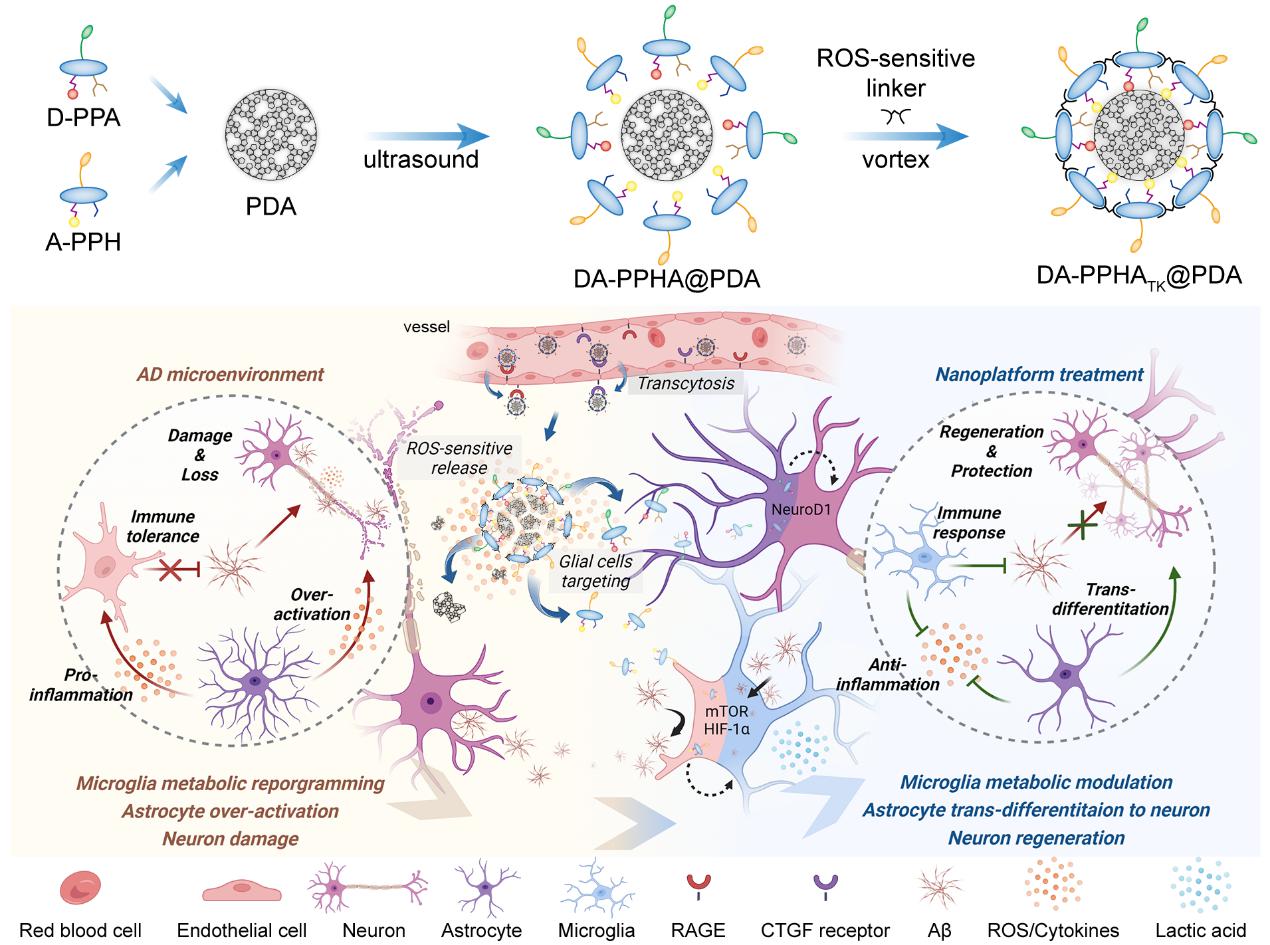 因此,在本项研究中h漫 蒋晨教授团队基于前期对PDC的研究基础,构建了一种PDC共递送平台。首先合成了偶联胶质细胞调控药物的两种PDC,通过静电吸附和共价交联的方式搭载于聚多巴胺(PDA)纳米粒表面。经静脉注射后,该递送平台通过转胞吞作用跨过BBB,在脑内炎症微环境中解离并释放两种PDC靶向胶质细胞。羟基氯喹(HCQ)被靶向递入小胶质细胞,激活免疫反应并恢复能量代谢。而全反式维甲酸(ATRA)被靶向递入星形胶质细胞,促进其转分化,同时减轻炎症水平。本研究摒弃了传统以神经元为核心的脑部疾病治疗策略,展示了一种调控休眠胶质细胞治疗AD的新方法。同时,该研究提供了一种PDC靶向递送的新策略,为疾病的多靶点治疗提供新的思路。该研究以 “A Peptide-Drug Conjugate-Based Nanoplatform for Immunometabolic Activation and In Situ Nerve Regeneration in Advanced-Stage Alzheimer's Disease”为题发表于最新一期Advanced Materials。