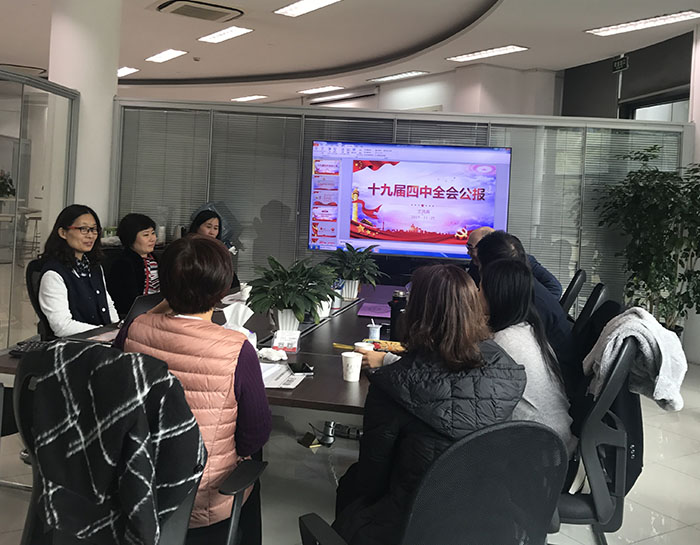 王凤霞书记首先领读《中国共产党第十九届中央委员会第四次全体会议公报》、《中共中央关于坚持和完善中国特色社会主义制度、推进国家治理体系和治理能力现代化若干重大问题的决定》,并结合“十九届四中全会公报”的幻灯片展示进行宣讲解读。王书记强调,各支部要把学习贯彻四中全会精神作为主题教育的重要内容,原原本本学,一定要把会议精神学习好、领会好、贯彻好,并结合自身学科认真思考,学以致用,切实把全会精神落实到行动上、贯彻到工作中。随后,王书记向支部书记们通报了学院近期的重要事务,总结了主题教育活动的进展情况,强调了下一步的工作重点,要促落实抓整改,突出主题教育活动实效。