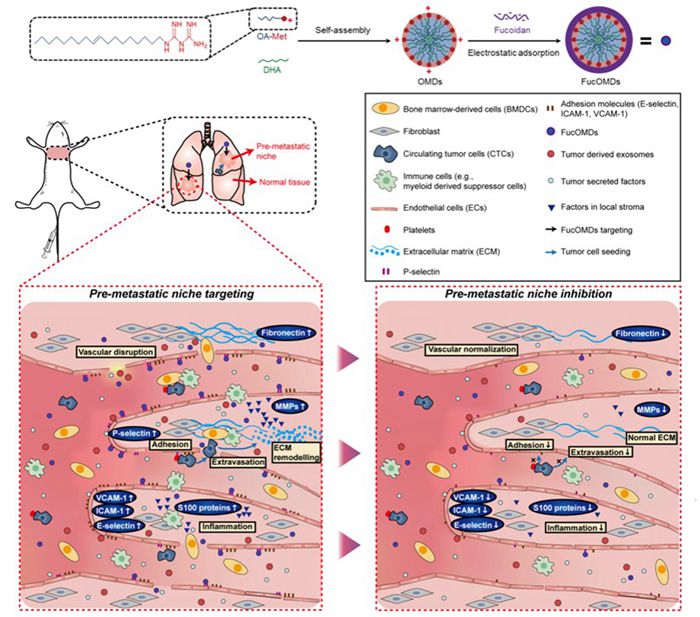 肿瘤转移前微环境是一种特殊的炎症微环境,可使循环肿瘤细胞(CTCs)定植,可作为预防转移的潜在靶点。然而,很少有研究致力于开发对症药物及递释系统来调节转移前微环境。h漫 陈钧教授和上海交大高小玲研究员团队合作报告了利用杂合靶向胶束以调节转移前微环境并抑制肿瘤转移的研究。该胶束采用两种低毒性抗炎化合物即脂肪链改造的二甲双胍和二十二碳六烯酸(DHA)自组装而成,其表面包覆岩藻多糖用于靶向转移前微环境。该功能化胶束(FucOMDs)具有良好的靶向效率和血液长循环特性,可以抑制CTC对激活内皮细胞的粘附,减轻肺血管通透性并逆转转移前微环境中关键蛋白的异常表达。体内外研究表明,FucOMDs可有效预防肿瘤转移的形成,并可与靶向化疗联合并有效抑制原发肿瘤的生长和转移。该研究为肿瘤转移前微环境的靶向治疗及抑制肿瘤转移提供了新思路,并具有临床转化前景。