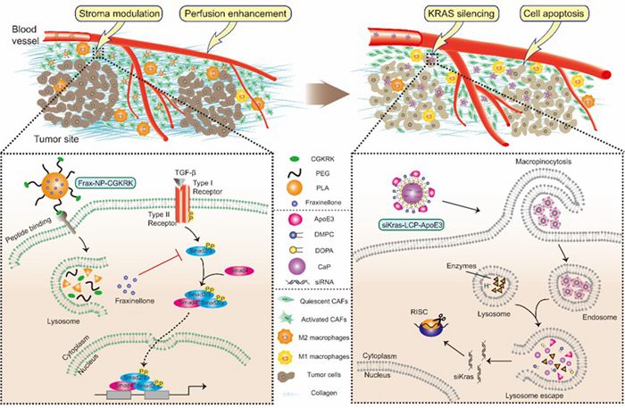 h漫 陈钧教授和上海交大高小玲研究员团队合作报道了联用微环境调节和肿瘤细胞靶点干预以提高胰腺癌疗效的研究。首先筛选得到具有TGF-β调节作用的天然产物梣酮,并将其包载于靶向纳米制剂中,其能抑制CAFs的活化,减少胶原的分泌,促进肿瘤血管正常化,弱化屏障作用而有利于后续制剂在肿瘤部位的渗透。其次,构建具有沉默KRAS突变功能的包载SiRNA的仿生化高密度脂蛋白纳米系统,该体系能够通过胰腺癌细胞攫取外界营养物质所依赖的大胞饮机制,从而被肿瘤细胞大量摄取;磷酸钙纳米内核可使SiRNA从溶酶体中有效逃逸并释放至胞浆,发挥基因沉默的作用。在胰腺癌原位模型上,将两种制剂贯序给药可起到高效低毒的治疗效果,显著延长荷瘤裸鼠的生存期。该研究可为基质丰富且无药可靶的肿瘤治疗提供设计思路和理论依据,具有较高参考价值。