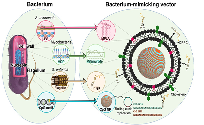 团队研究人员根据细菌的构造,采用仿生策略将来自于多种细菌不同细胞结构的佐剂活性成分整合于一体,以发挥协同的免疫刺激作用。将沙门氏菌细菌脂多糖减毒成分单磷酰脂质A和分枝杆菌胞壁酰二肽的类似物米伐木肽嵌入脂质体磷脂双分子层中,模拟细菌细胞壁;脂质体表面连接重组表达的沙门氏菌鞭毛蛋白,模拟细菌鞭毛;脂质体包载含有非甲基化胞嘧啶鸟嘌呤二核苷酸序列的DNA纳米颗粒,模拟细菌拟核,制备得到细菌仿生癌症疫苗佐剂。它能够通过多条信号通路激活免疫系统,对小鼠黑色素瘤的治疗和预防效果显著优于弗氏佐剂。更重要的是,该免疫佐剂与光热治疗相结合可作为光热自体肿瘤疫苗,一方面通过光热物理治疗杀死患者肿瘤细胞;另一方面,利用被杀死的肿瘤细胞所释放的肿瘤特异性抗原,结合免疫佐剂激发机体的免疫反应,杀死残余肿瘤细胞,达到根治肿瘤和预防肿瘤复发的目的。该光热自体肿瘤疫苗可治愈50%的小鼠黑色素瘤且不再复发。