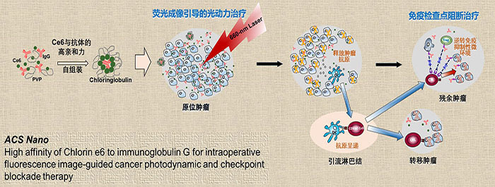 团队研究人员偶然发现免疫球蛋白G(就是通常说的抗体)与一种叫作二氢卟吩的光敏剂分子存在天然的高亲和力,利用该分子间的亲和作用,将光敏剂分子以“搭便车”的形式,由大分子抗体携带进入肿瘤,在增加肿瘤内富集的同时并不延长光敏剂在血中的清除速率。这种制备方法可以将任意一种或多种免疫检查点阻断抗体与光敏剂进行组合,实现术中荧光影像指导的光动力联合免疫检查点阻断治疗的新疗法。