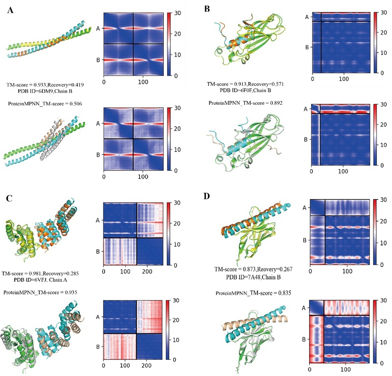 ProBID-Net(上)和ProteinMPNN(下)设计序列预测结构叠合比对与AlphaFold-Multimer预测链间PAE热图