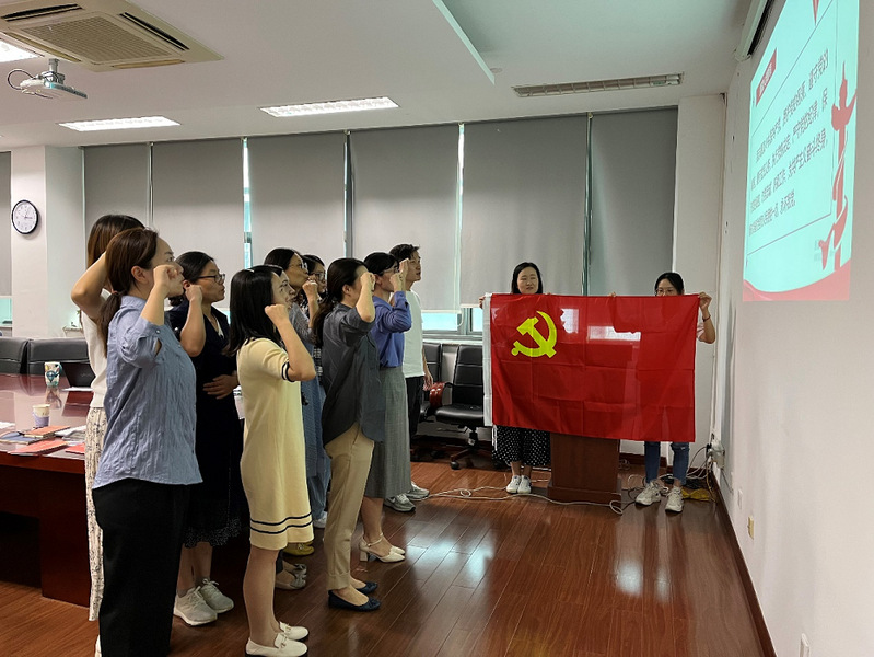 随后,教工第五党支部开展“政治生日忆初心,砥砺奋进再前行”活动。洪兰老师为史雪茹、王宁宁、冯梅、虞文嫣、姜慧芳、刘黎馨6名过“政治生日”的同志送上了贺卡,希望大家牢记党员身份,不忘入党初心。刘黎馨老师作为9月入党的党员代表分享了自己的入党初心和历程,并由衷感谢党组织的关怀和领导的教诲,表示今后要时刻督促自己,继续向身边优秀的党员同志学习。紧接着,全体党员高举右拳,面向鲜红的党旗,重温了入党誓词,铿锵恢弘的誓言响彻全场。
