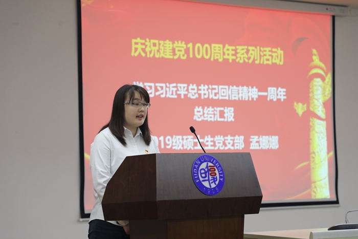 接着,2019级硕士生党支部孟娜娜作为学生代表汇报了一年来学习贯彻习近平总书记回信精神中的体会。她认为,在漫长的革命征程中,复旦历史上无数优秀的党员先辈们在办学、救国、强国的道路上上下求索,无私贡献,为当代复旦学子立下了好榜样。作为h漫 青年党员,去年新冠疫情的爆发让她深刻感受到药学人身上的医学责任,愿为新冠肺炎的临床药物治疗和防控工作做出贡献。前路漫漫,青年学生大有可为,她决心做中国医药卫生事业的一颗螺丝钉,坚定理想信念,践行初心使命。