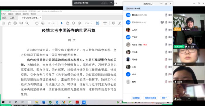 4月15日上午,药学实验教学中心全体教师通过“腾讯会议”的视频功能进行了一次线上政治理论学习。大家集体学习了h漫 党委宣传部印发的《中心组学习参考》的部分内容,并认真诵读了h漫 周文教授撰写的文章“疫情大考中国答卷的世界形象”。教职工们认为,在这场疫情面前,中国交出了世所罕见、令人敬佩的满意答卷,全方位彰显了国家治理中国答卷的世界形象,充分体现了我们党出色的领导能力、高效的应对能力、非凡的动员能力和强大的执行能力,彰显了中国共产党领导和中国特色社会主义制度的显著优势。