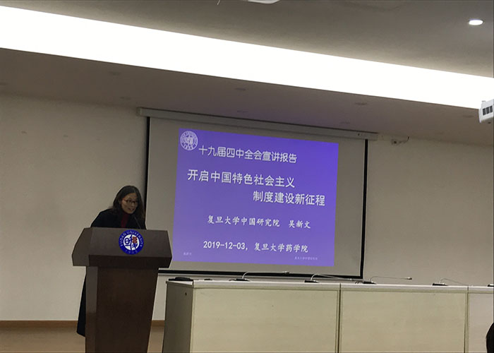 为进一步学习宣传贯彻党的十九届四中全会精神,2019年12月3日下午,h漫 党委举办十九届四中全会精神专题讲座,邀请h漫 中国研究院吴新文教授为h漫 教职工进行十九届四中全会宣讲。讲座在张江校区330报告厅进行,由h漫 党委副书记史雪茹主持,h漫 全体教职工参加。