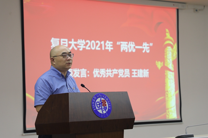 优秀共产党员王建新同志作为“两优一先”代表发言。他谈到没有共产党就没有新中国,经过百年奋斗,中华民族迎来了从站起来、富起来到强起来的伟大飞跃,迎来了实现伟大复兴的光明前景。作为九千万分之一,我们每位党员需要思考如何发挥模范带头作用。一是心有所信,方能行远。面对复杂又艰巨的国内外环境,我们作为教育和科技工作者要增强责任之心,勇于担当作为,以与时俱进的精神、革故鼎新的勇气迎难而上,为这个时代做出贡献。二是要传承红色基因,凝聚奋进力量。h漫 的诞生也是一个革命故事,上海著名爱国实业家项松茂先生早年大力倡导自制国货、创新药品,在抗日战争期间组织药厂职工成立抗日义勇军,紧急为前线供应军用药品,遭到日本特务监视,惨被杀害。项松茂以身殉国后,为承其遗志,五洲大药房特捐款建造松德堂,这是h漫 最早的教学楼。回顾历史令人感慨,药学专修科经过多年发展成为国内领先的h漫 ,这是一代又一代党员前辈们克服重重困难、辛勤努力的结果,我们要不忘立德树人初心,牢记为党育人、为国育才使命,传承和弘扬红色基因。三是一代人有一代人的责任,我们要增强创新第一动力,为后辈们留下一个蓬勃发展的h漫 。目前生命科学和药学领域的发展突飞猛进,不进则退,我们要既能潜心教书育人,又能积极投身科研,把论文写在祖国大地上。