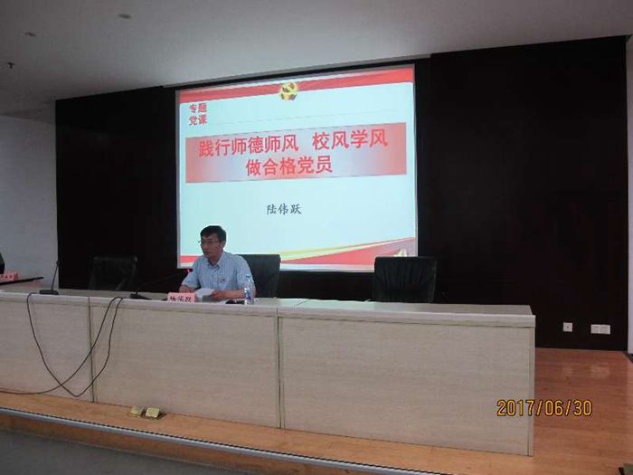 随后,陆伟跃书记围绕“践行师德师风、校风学风,做合格共产党员”这个主题给全体党员讲授了一堂生动深刻的“七一”党课。陆书记带领大家重温了党章所规定党员必须履行的8项义务,强调要始终牢记党员是我们的第一身份,要带着敬畏、带着感情、带着责任去发挥模范带头作用。党员教师无论在教学、科研和管理工作中,要从大局着眼、小处着手,用求真务实、一丝不苟的精神做好每一件事,既要教学生科学知识和培养学生科研能力,还要传授学生做人的道理,为学院师德师风建设做出积极贡献。要求党员教师和党员学生要做校风学风的表率,自觉将社会主义核心价值观融入学习风气和学术风气建设的全过程。党员学生应该在知识学习、能力培养和社会责任感培育中起模范带头作用;党员教师应该在把牢学术诚信关、营造风清气正学术氛围中起模范带头作用。