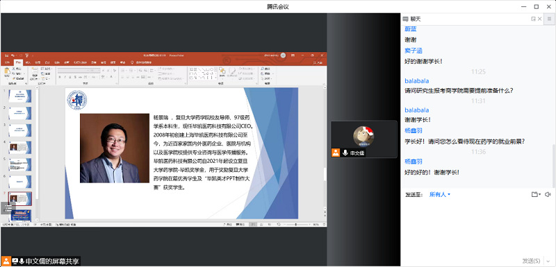 在问答环节,杨景瑞校友针对“创业的基础是什么”“外企研发离开国内市场对咨询行业的影响”“药学专业的就业前景”“临床药学专业的发展”等问题与同学深入交流,一一解答,他认为当前时代是药物发展最黄金的时代,能为医药学生的发展提供更广阔的平台。他鼓励大家勇于尝试,在夯实专业知识的基础上大胆尝试,突破自我。