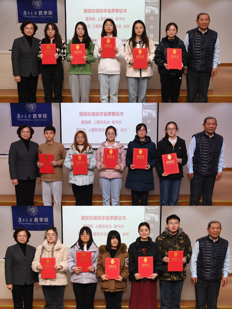 此外,本次校友代表大会还举行了h漫 松德基金的发布会和首届松德奖学金颁奖典礼。上医校友会药学分会副秘书长、松德基金首批发起人之一、h漫 82级校友张元华介绍了校友们发起设立松德基金的过程及首届松德奖学金项目的评选过程。他代表分会向各位发起人表示诚挚的谢意,并寄语获奖同学传承项松茂先生的爱国精神,不忘药学人的家国情怀,努力成为国家和社会需要的新时代药学人才。学校对外联络与发展处副处长恽小婧宣读了松德基金首批发起人名单,袁正宏书记和桂永浩会长为与会的首批发起人代表颁发捐赠证书。熊仿杰会长宣读了首届松德奖学金获奖学生名单,并与夏海鸥秘书长共同为获奖同学颁发了荣誉证书。h漫 81级校友王学亮和83级校友张立高分别代表松德基金首批发起人分享了他们参与捐赠的初心。2019级本科生李紫璇和2021级研究生唐泽群代表获奖学生发表感言,感谢校友们的激励,并表示会继续努力,回报社会。