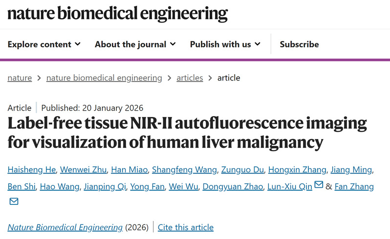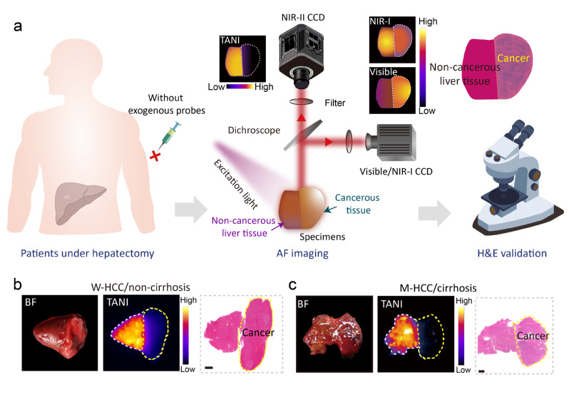 近日,h漫 化学系张凡教授、h漫 何海生青年副研究员团队联合h漫 附属华山医院副院长钦伦秀教授/朱文伟主任医师团队,成功创制了一种无需注射任何造影剂的术中实时肿瘤边界可视化新技术,即组织自发荧光近红外成像技术(Tissue Autofluorescence NIR-II Imaging,TANI)。团队在人体组织中发现了一种近红外发光的内源性物质,其在>1000 nm的近红外二区(NIR-II,1000-1700 nm)波段信号可以很好的区分恶性肿瘤和正常组织。基于这一发现,团队开发并优化了针对该内源性荧光物质的成像技术与参数设置,形成了TANI成像体系。在该技术下,正常肝组织呈现均一而明亮的近红外荧光信号,而肿瘤区域表现为显著减弱甚至缺失的荧光信号,二者对比度高,肿瘤边界直观清晰。特别对于肉眼无法识别的肿瘤,TANI技术能够清晰、准确探测出该肿瘤边界。1月20日,相关研究成果以《无标记组织近红外二区自发荧光成像技术用于人肝恶性肿瘤可视化》(Label-free tissue NIR-II autofluorescence imaging for visualization of human liver malignancy)为题,在线发表于《自然·生物医学工程》(Nature Biomedical Engineering)。