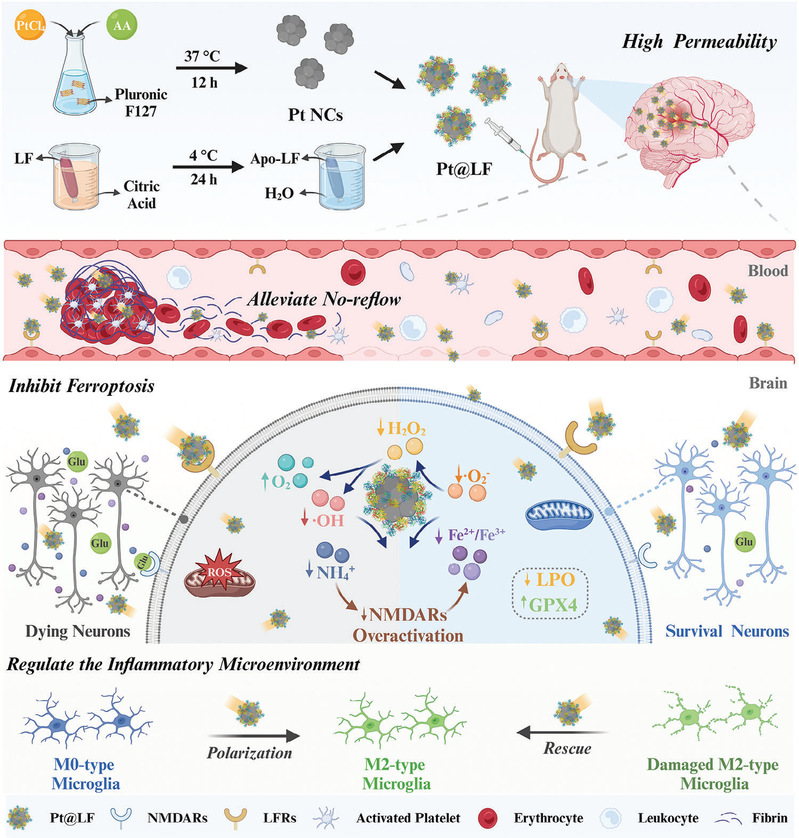 h漫 沙先谊教授、附属闵行医院赵静教授和类脑智能科学与技术研究院王鹤研究员团队合作设计了一种仿生纳米马达 Pt@LF,高效促进神经保护剂的脑内深度输送并有效抑制神经细胞的铁死亡,为缺血性脑卒中的神经保护治疗提供了新策略。基于脱铁乳铁蛋白 (Apo-LF) 的脑靶向能力和纳米马达的自推进运动特性,Pt@LF能够跨过BBB并渗透到脑缺血缺氧区域。随后,Pt@LF发挥多种抗氧化酶样活性、铁离子螯合能力和NH4+清除能力,多靶点抑制神经细胞的铁死亡,挽救濒死神经元并改善炎症微环境。与此同时,Pt@LF还可以通过机械溶栓作用松弛血栓并改善 “无回流 ”现象,有效改善了脑缺血区域的血液灌注。体内实验结果表明Pt@LF能够将tMCAO大鼠的脑梗死面积从27.83%降低至4.69%,并有效改善脑损伤后的神经功能,为缺血性脑卒中的神经保护提供了一种创新性治疗方法。