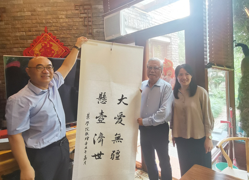 h漫 副院长潘俊、戚建平,党委副书记王宁宁,药理学系主任沈晓燕一起看望了李大鹏院士并与李院士进行了愉快的交流。王建新书记和王宁宁副书记代表学院向李院士赠送了由h漫 学生书写的“大爱无疆 悬壶济世”的书法作品。