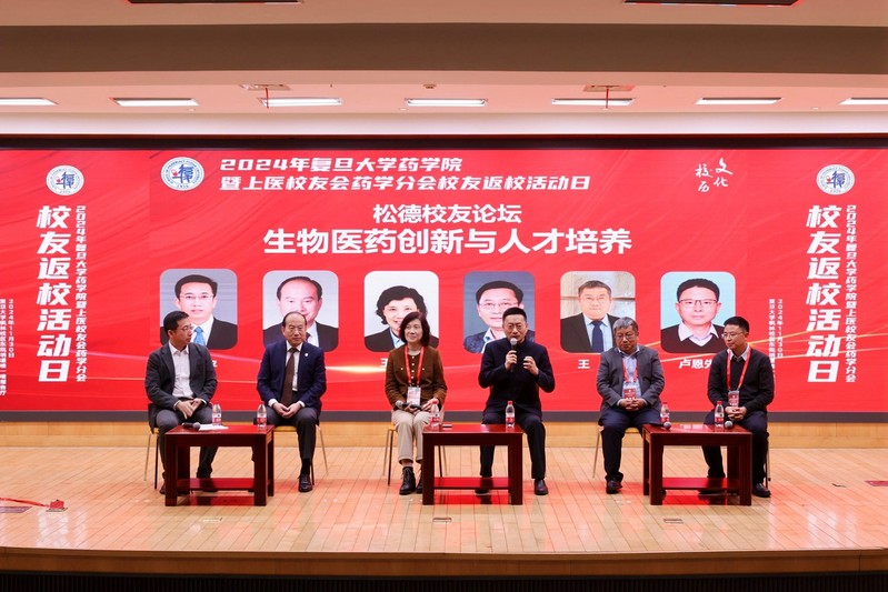 随后的圆桌论坛邀请到5位来自生物医药“政产学研医”各领域的优秀校友,他们分别是78级药化专业校友、h漫 特聘教授陆伟跃,84级药化专业校友、上海市食品药品检验研究院院长王彦,85级药学专业校友、上海惠永药物研究有限公司董事长王浩,88级药理专业校友、h漫 附属华山医院党委书记郑宁,以及94级药学专业校友、上海奥全生物医药科技有限公司CEO卢恩先。5位校友分别结合各自的从业经历发表了对生物医药创新与人才培养的见解。陆伟跃校友以他多年从教和科研经历分享了他对于如何创新以及如何把创新成果转化成新质生产力的观点;王浩校友在从事了多年药物研发工作之后创业建立药物研发公司和生产基地,他强调将高校科创成果与产业很好的结合对于提升我国生物医药产业创新能力的重要性。王彦校友以她一直在药品检验、监管领域的从业经历,提出要实现产学研融合,关键在于要找对合适的项目、合适的企业,特别是要找到合适的合作人,才能推动科研成果的产业化。郑宁校友则以他丰富的职业生涯和工作经历给学弟学妹们“每一个当下都应当全力以赴”和“对新生事物时刻保持好奇心和敏感敏锐态度”的谆谆教诲;强调“医药不分家”,并指出临床药学和临床药师对于医院工作的重要性。卢恩先校友以他多年从事改良新药研发转化的经历,分享了他对生物医药创新的理解。最后,校友们纷纷祝福h漫 人才辈出,基业长青,在生物医药创新和人才培养方面做出更大的贡献。