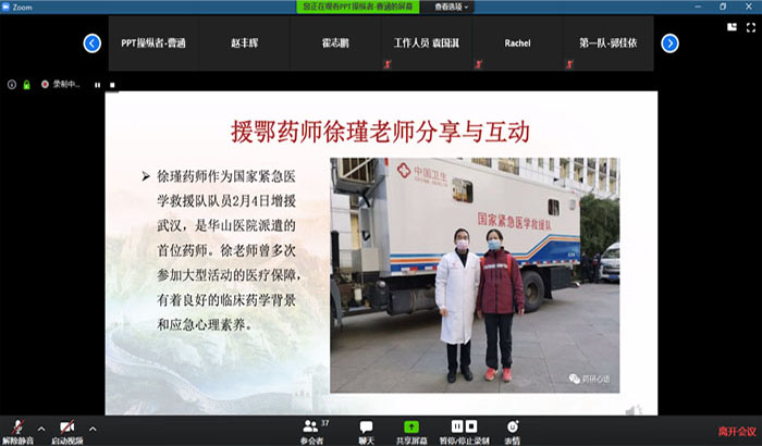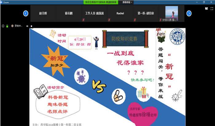 为进一步做好新冠疫情防控的宣传工作,普及当前国家防疫形势、医药研究进展,为国家和学校的防疫工作贡献自己的一份力量,h漫 2018级博士第一、第二党支部联合h漫 教职工第七党支部于2020年4月29日在ZOOM在线会议平台共同举办了主题为《新冠肺炎,“药”你好看》的防疫科普知识竞赛活动。活动还特别邀请了驰援武汉的h漫 附属华山医院药师徐瑾老师为我们分享她在武汉的工作情况与感受。