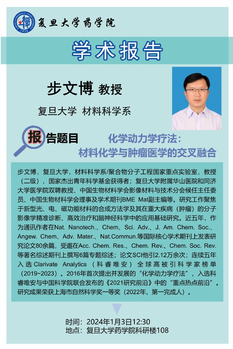 步文博教授1月3日学术报告-化学动力学疗法:材料化学与肿瘤医学的交叉融合