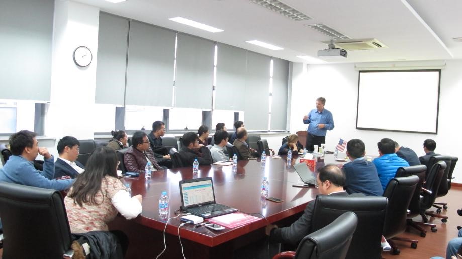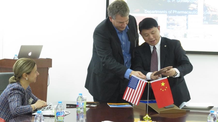 4)2016年11月22日下午,h漫 药剂教研室邀请美国密歇根大学制药科学系主任Steven P. Schwendeman 教授夫妇访问h漫 。在h漫 科研楼晶晖厅王明伟院长首先向Schwendeman教授夫妇的来访表示欢迎,并介绍了h漫 的情况。随后,h漫 副院长、重点实验室副主任王建新教授主持了Schwendeman教授题为“Mechanistic evaluation of in vitro and in vivo release from PLGA microspheres employing a cage model”的学术报告,他着重介绍了PLGA纳米微球的体内外评价和其课题组的研究情况。听众们饶有兴趣地听取了报告,并与Schwendeman教授进行了交流。大家认为,Schwendeman教授带来了很多新的理念和想法,对今后的科研工作具有帮助。随后,Schwendeman教授夫妇在重点实验室主任陆伟跃教授和副主任王建新教授的陪同下参观了科研楼九楼的中试实验室和一楼仪器测试中心。