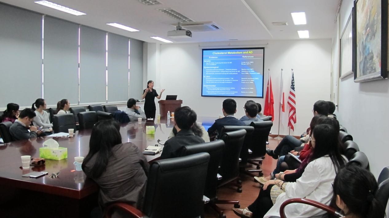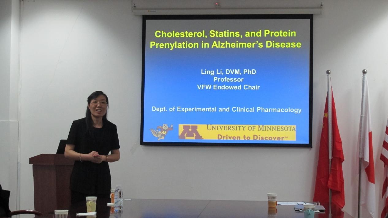 1)2016年4月20日,h漫 药剂教研室邀请美国明尼苏达大学实验与临床药理学李玲教授来访,并为h漫 广大师生带来了题为“Cholesterol, Statins, and Protein Prenylation in Alzheimer’s Disease”的精彩学术报告。李教授主要从事血脂代谢异常与阿尔茨海默病(AD)发病机制研究。先后承担NIH/NIA、阿尔茨海默病药物发现基金会等研究项目。李教授的讲座内容与药剂学密切相关,受到热烈欢迎。