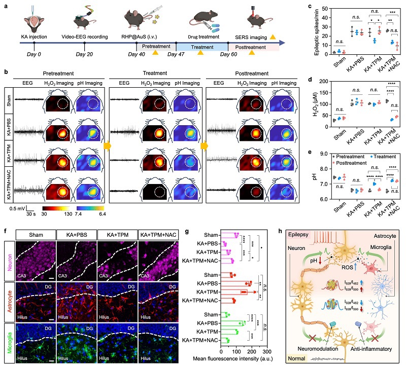 图7. RHP@AuS监测癫痫小鼠的药物治疗效果。(a)癫痫小鼠模型的建立、药物治疗和原位脑SERS成像流程图。(b)癫痫小鼠注射RHP@AuS后在药物治疗前、治疗中和治疗后的SERS比率成像。(c)脑电图尖峰数量统计。(d)RHP@AuS定量的癫痫灶中H2O2浓度统计。(e)RHP@AuS定量的癫痫灶中pH值统计。(f)代表性共聚焦图像显示海马中神经元的存活、星形胶质细胞和小胶质细胞的活化。(g)同侧海马中NeuN、GFAP和Iba-1的平均荧光强度定量。(h)联合疗法通过协同炎症调节和酸碱平衡来缓解癫痫的示意图。