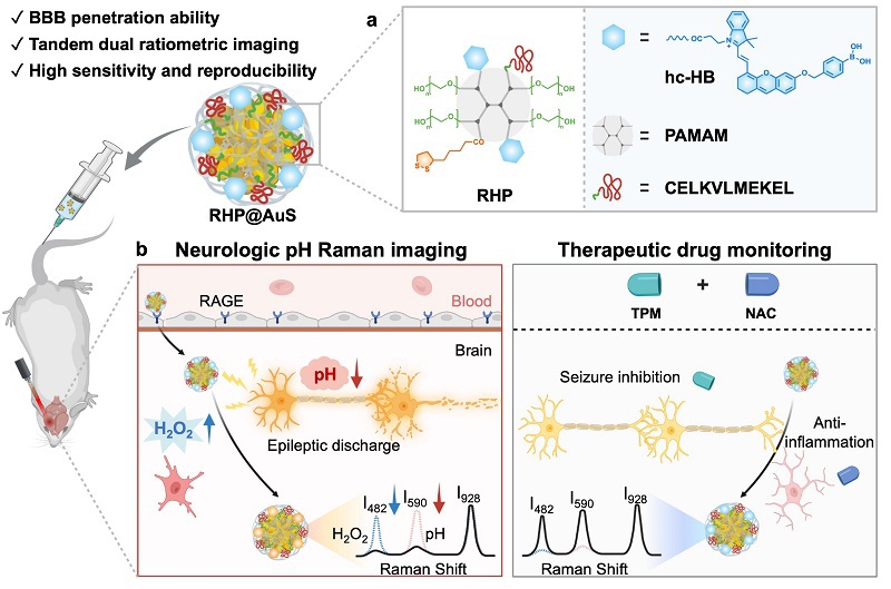 近日,h漫 王聪青年研究员、李聪教授、类脑智能科学与技术研究院王晶副教授和云南大学h漫 雷祖海教授在Angewandte Chemie杂志上发表了题为:“Tandem Dual-Ratiometric SERS Probe Enables Raman Imaging of Neurological pH Fluctuations in Epilepsy”(串联双比率响应SERS探针成像癫痫病灶pH波动)的研究性论文(图1)。该工作开发了一类单光谱串联双比率响应SERS探针(RHP@AuS),实现脑部癫痫病灶pH动态监测与药物预后评估:(1)提出了一类基于树枝状聚合物的可调节性拉曼报告分子单层自组装策略,可有效抑制分子堆叠诱导的信号淬灭效应,显著提升拉曼信号强度和稳定性。(2)构建了一类可特异性富集在癫痫灶、H₂O₂开关-pH数字化读取的串联双比率型SERS探针,实现了病灶pH动态定量读取。(3)揭示了癫痫发作导致病灶局部脑区快速酸化的波动规律,提出了一种“酸碱平衡-炎症调节”的联合疗法,实现了癫痫长效持久的治疗效果。总之,该工作构建了一种高灵敏度、高特异、准确动态监测脑部疾病pH震荡的可视化工具,并为癫痫等脑疾病的精准诊疗开辟了新维度