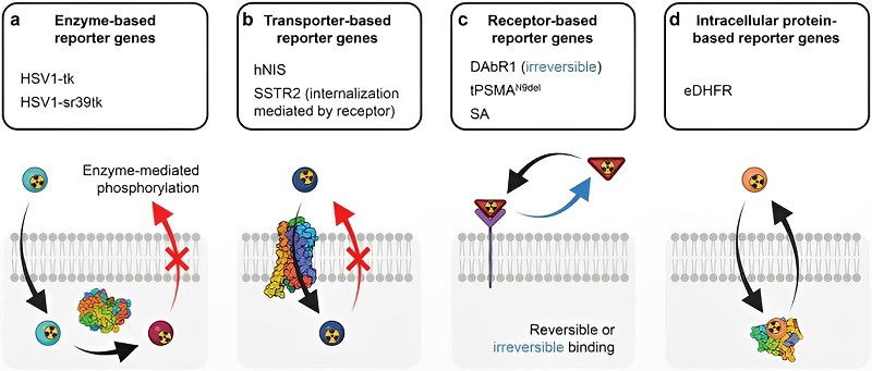 CAR T细胞是“活的”药物,其在体内的存活、增殖是实现治疗效果的先决条件。为此,开发了基于报告基因的成像策略,以指示CAR T细胞的存活情况。报告基因是指编码通常不存在于正常生物体或至少目标区域中的酶、受体和转运蛋白的基因,它们的表达可以很容易地被标记试剂识别。由于只有CAR T细胞表达报告基因,该策略具有标记特异性。此外,因为报告基因表达停止,已经死亡细胞不会被检测,使该技术只追踪活的CAR T细胞。本工作将已有CAR T细胞报告基因方法总结为四类:(1)基于酶的报告基因;(2)基于转运体的报告基因;(3)基于膜受体的报告基因;(4)基于胞内蛋白的报告基因(图3)。