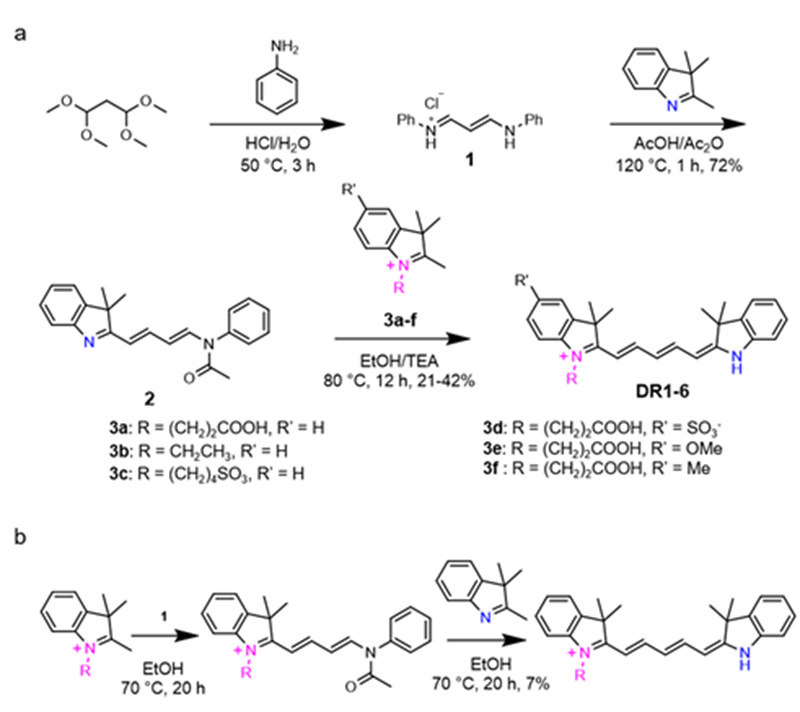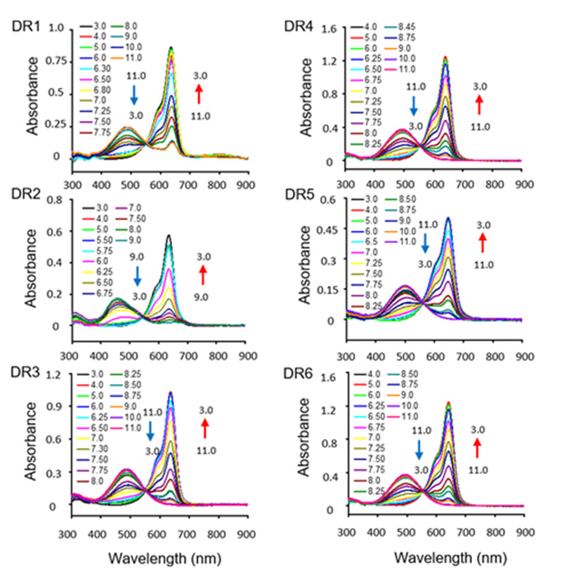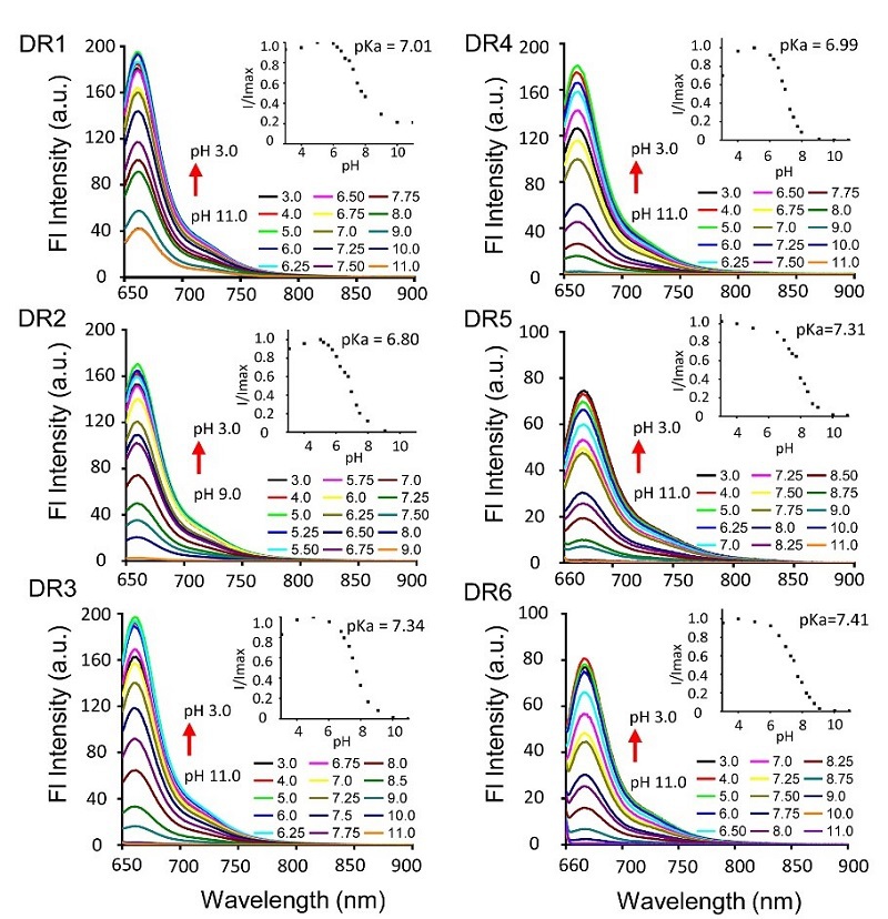 本工作首先合成了6个基于不对称五甲川花菁的荧光分子DR1-6,提出了“顺序选择性”合成策略,使产率有效提高(图1)。所有产物均显示出pH响应的吸收和发射光谱(图2‒3)。