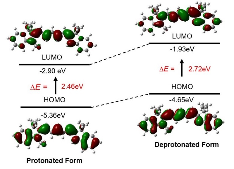 通过TDDFT轨道计算策略(图4)确认了基于不对称五甲川花菁结构DR1-6荧光探针的pH响应机制。