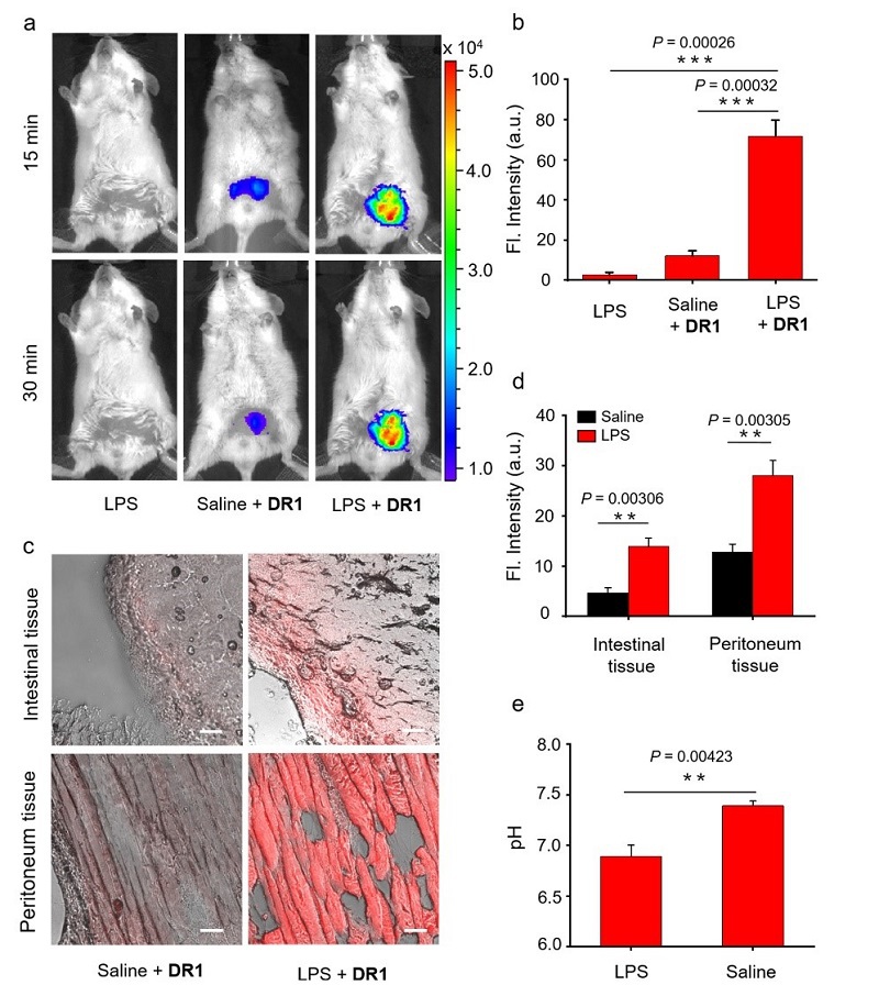 (b) 腹部平均荧光强度 (n = 3)。(c) LPS、生理盐水+DR1与LPS+DR1组的腹部、肠部组织切片(Ex = 633 nm)。(d) 组织切片的平均荧光强度 (n = 3)。(e) pH计策略腹腔液pH值 (n = 3)。