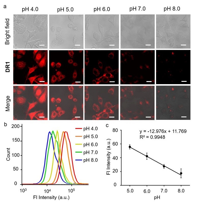 (b)不同pH下经DR1孵育Hela细胞流式数据。(c) 细胞荧光强度与pH值的线性关系,n = 3